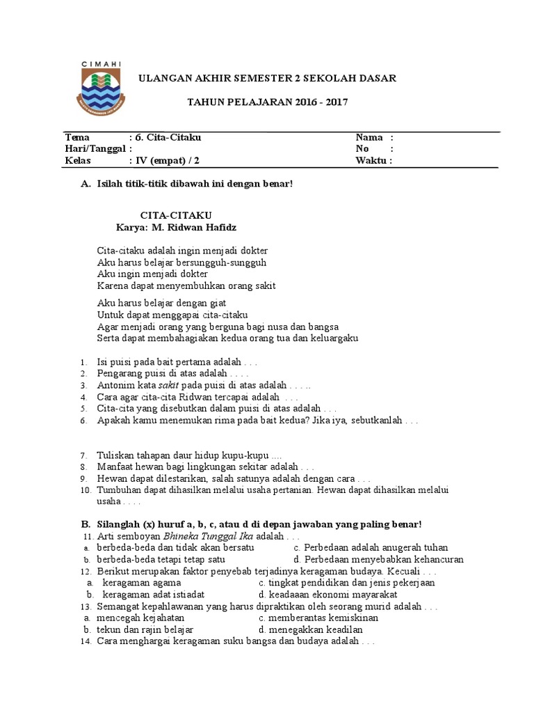Pdf Soal Tematik Kelas 4 Tema 6 Subtema Kurikulum 2013 Revisi 2018 Avinda Muanizt Academia Edu from 0.academia-photos.com Terimakasih telah menyaksikan video ini. Tempat di mana aku harus berjuang untukmu. Jiwa pejuang kemerdekaan dulu 3. Menjadi guru itu mulia mengajar dan mendidik para siswa aku akan semangat meraih cita citaku belajar dengan giat sepanjang waktu. Harapan dan cita citaku untuk indonesia good news from indonesia. Rima puisi cita citaku halaman 17 belajar kurikulum 2013. Puisi dokter hewan 3 bait kumpulan puisi. Puisi baru bisa dikatakan bebas tanpan kaidah puisi lama nah aku coba membuat puisi baru dengan 2 bait tadinya mau 5 bait tetapi kepanjangan hehe.